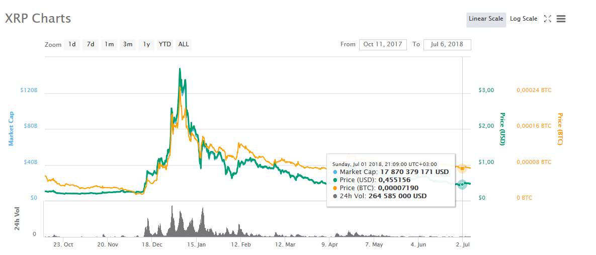 Ripple – один из главных хедлайнеров криптовалютного рынка на рубеже 2017-18 гг., когда суммарная рыночная капитализация приблизилась к триллиону долларов. XRP, как и другие монеты и токены, упал в стоимости в течение первого полугодия 2018 года. Но в сравнении с коррекцией Bitcoin и Ethereum падение курса Ripple выглядит куда более драматичным и серьезным.